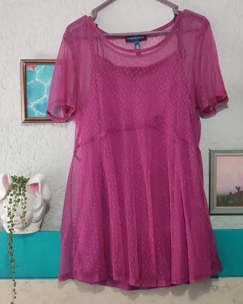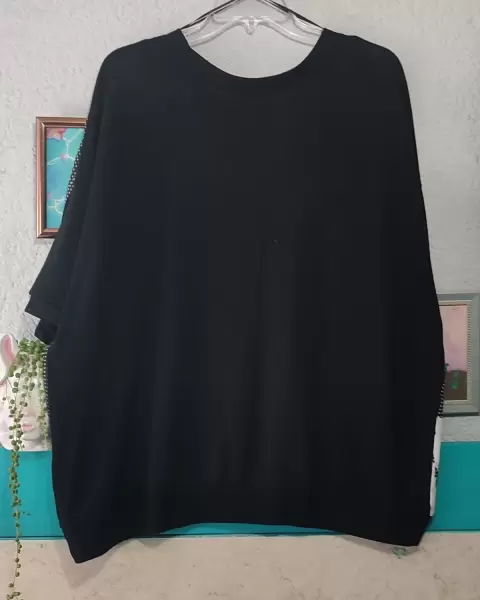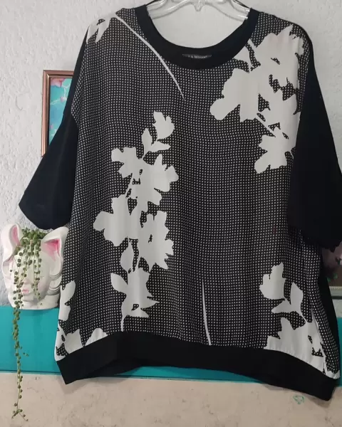 Dúo blusas xl. Dúo de blusas , bugambilia dos piezas camiseta strech con un detalle de tinta azul y Blusón transparencia en perfecto estado , blusa negra con estampado espalda tela de punto manga corta las dos talla XL ideal para usar con mezclilla