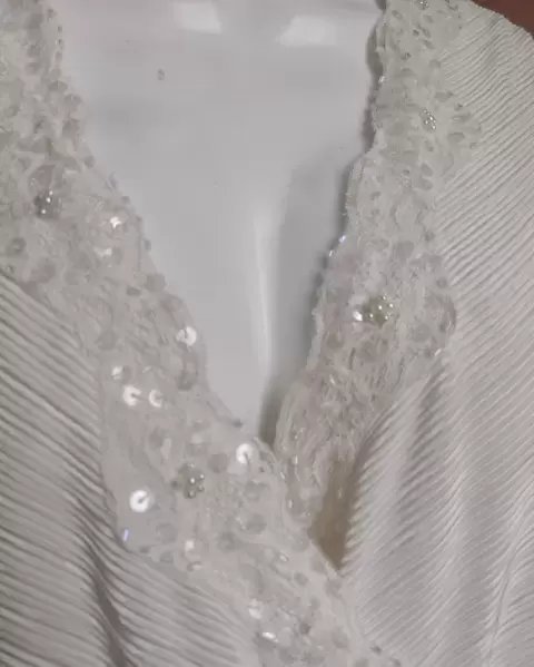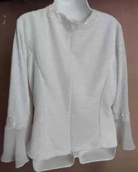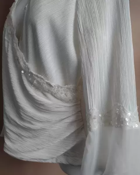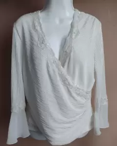 Blusa de importación , en color perla , manga 3/4 , con hermosas aplicaciones de encaje bordado con perlas y lentejuelas cuello cruzado talla L