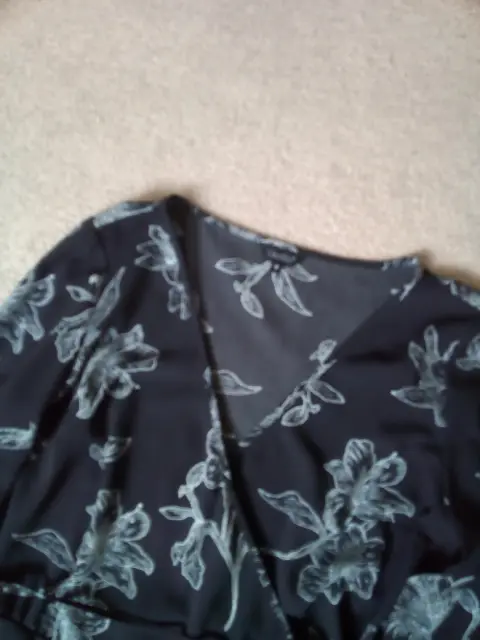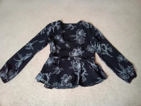 Elegante blusa. Blusa elegante manga larga de fondo negro y estampados blancos se ajusta con cinta alrededor de la cintura
