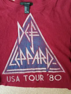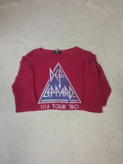 Forever 21 crop top estampado del Usa world tour 80' de la banda de rock Def LeppardColor vino en talla Small, en muy buen condición muy poco uso, sin desgaste, ni detalles.Medidas: 39 cm de largo, 120 cm ancho de axila a axila, 104 cm de ancho en abdomen, 47 cm de largo en mangas.Materiales: 61% algodón y 39% poliéster.