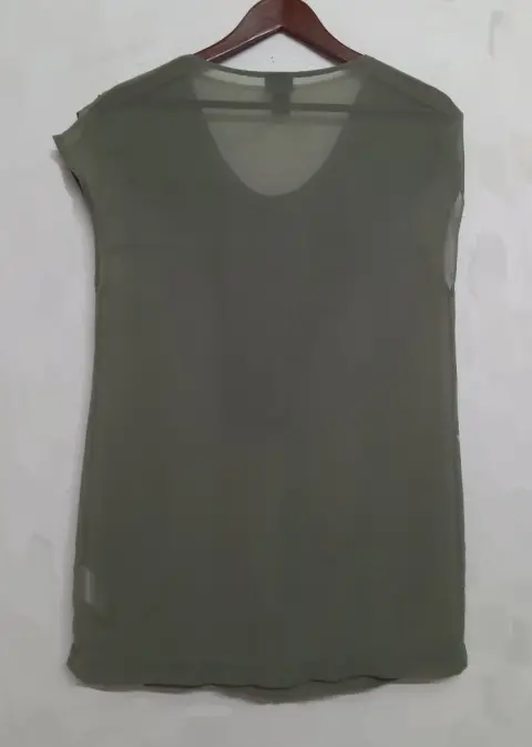 Fresca blusa con olanes. En fresca y gaseosa tela olivo y detalle de cuello con olanes en caída y estoperoles, ligera y holgada.