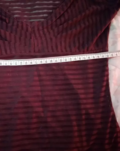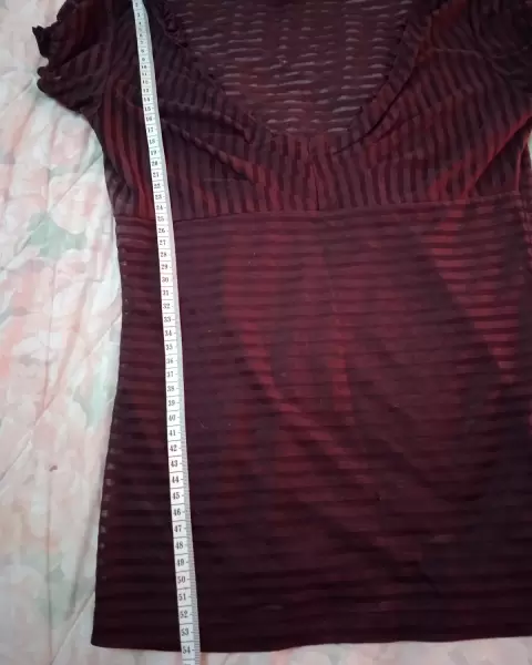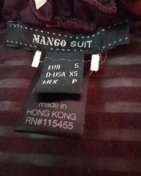 Es de color café con ratitas verticales en el área del pecho y un corte que simula un moño en el pecho, al bajar las rayas son horizontales en el área del estómago, de manta corta. Es talla XS, puse foto de las medidas, es marca Mango.