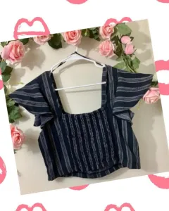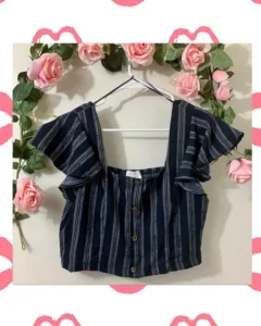 Crop top gris con negro con botones al frente y manga con buelito ajuste en espalda con elástico queda como la última imagen