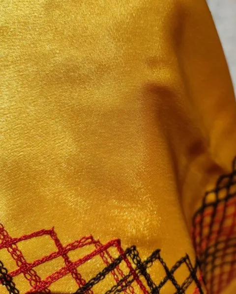 Hermoso huipil bordado de cadenilla, originario de Oaxaca, color amarillo, tela satinada. En la segunda foto se puede ver el color al sol. Está abierto para que lo cierres a tu medida y forma. 63 cm de ancho, 56 cm de largo