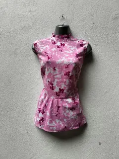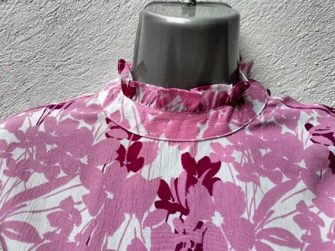Linda blusa manga Corta súper elegante, con cuello algo y efecto plisado en el cuello botón trasero atrás del cuello, no estir