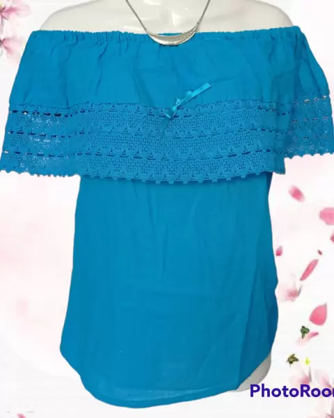 Linda blusa campesina. Blusa campesina de cuello de olan y resorte. Con hermoso detalle de tira bordada.Tela de algodón que no estira pero viene amplia.