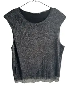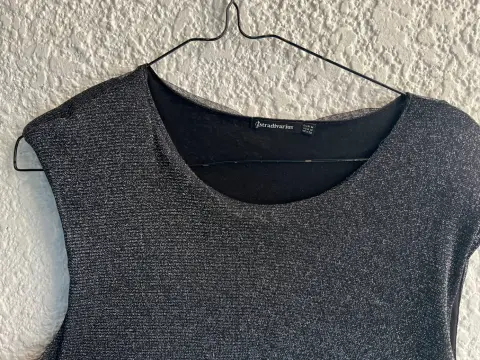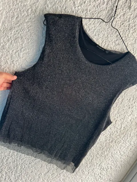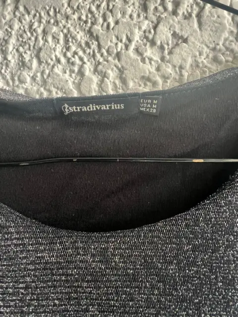 Linda Blusa Stradivarius Talla 28 , de Gasa con forro, ideal para el antro o fiesta formal muy juvenil , la tela es negra con destellos plateados sin un solo detalle de uso.Largo 56cmAxila a axila 52cm
