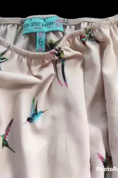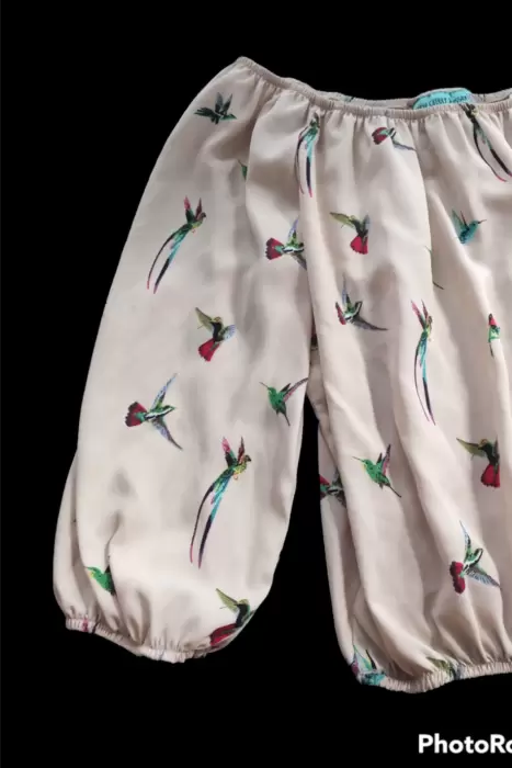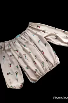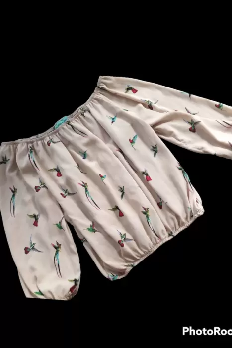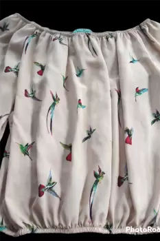 Linda blusa de escote redondo tipo campesina, manga 3/4, con elastico en la parte del escote y mangas. Tela fresca y suave ideal para climas calidos, el estampado esta hermoso son colibris de colores. Dice talla grande pero le queda a una mediana.