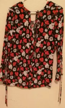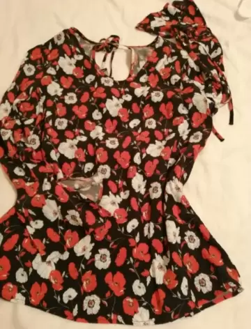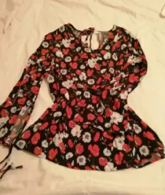 Linda blusa de flores, tiene manga de campana con listones para ajuste, un bonito y no profundo escote en la espalda y cinta para ajustar x la espalda en lugar de botón, esta Seminueva y tiene un detalle en la manga, se le está descociendo el pequeño dobles q se les hace, pero de ahí en fuera esta en perfectas condiciones, medidas: axila a axila 56 cms, largo 64 cms de largo.