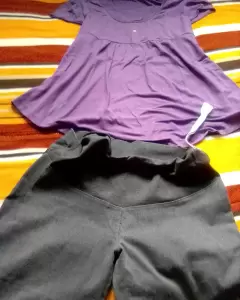 Maternidad. Blusón mediano morado con cintas por la parte de atrás, para su ajuste.Pantalón gris ajustable en la cintura