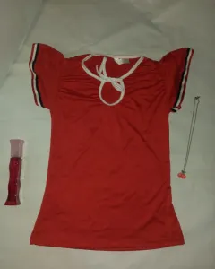 Hermosa blusa color roja con varios detalles que la hacen unica de la marca adore talla s, sin ningun detalle, de hombro a hombro:35 cm aprox. Largo: 53 cm aprox. Se estira un poco, tambien incluyo un perfume dela marca fraiche con poco uso pero si esta algo raspado el envase, el collar son 2 cerezas unidas.