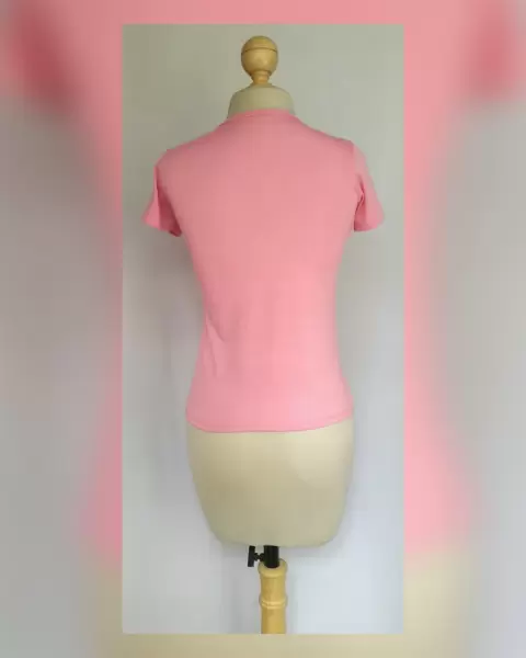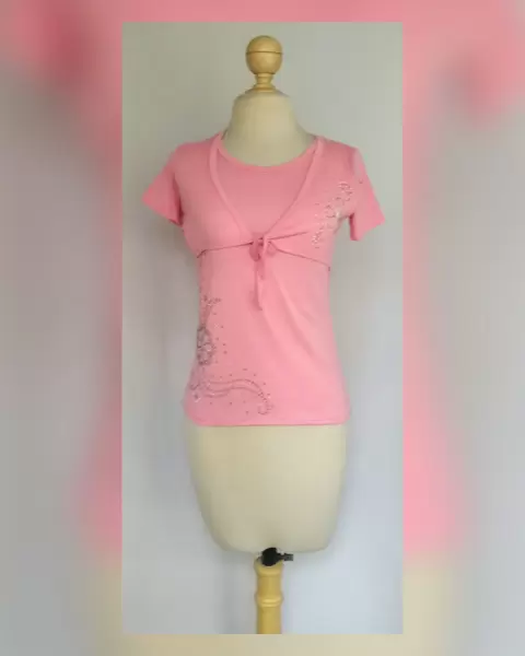 PAQUETE Blusa c/Aplique y Arracadas. PAQUETE Blusa tono ROSA BEBÉ c/aplique bisutería, top simulado c/tiras mismo tejido p/mejor ajuste, cuello redondo y manga corta. Unitalla (reducida, da mejor a M) Arracadas tono PLOMO c/bisutería translulúcida y cierre p/clip. Dimensiones cms: Blusa 33.5 hombro, 46 axila, 38.5 cintura, 46.5 zona baja, 54.5 largo, 14.5 largo manga Aretes 7 circunferencia. 50% algodòn, 50% poliéster / Aleación zinc