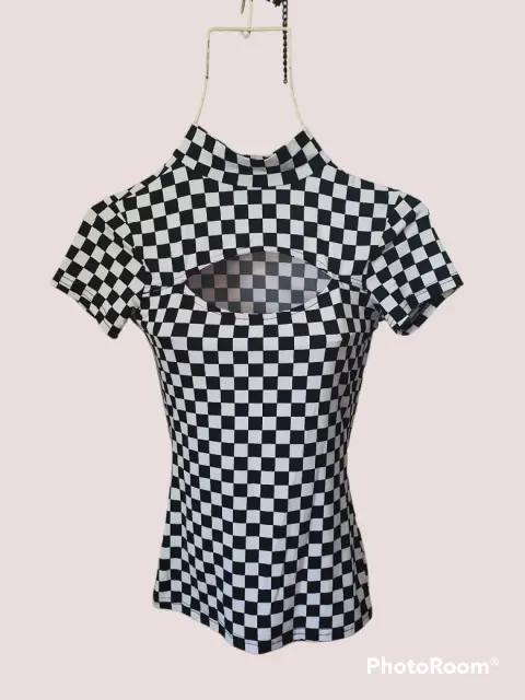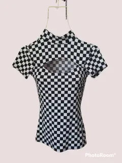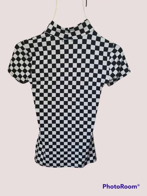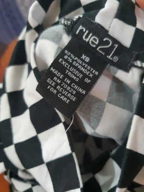 Playera estampada. Talla XS. Marca Rue21. 92% poliéster, 8% espandex. Escote ovalado al frente, con cuello pequeño de tortuga.