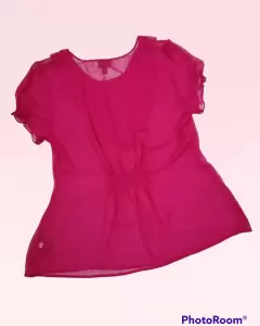 Bonita blusa de gasa con volados al frente, cuello redondo y manga corta