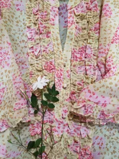 Preciosa blusa vintage. Unico uso, manga 3/4, detalle con olanes al frente y en las mangas, botones forrados, cuello Mao con escote V. Preciosa combinacion de colores. Tela con transparencias ideal para verano, tonos rosados y durazno.