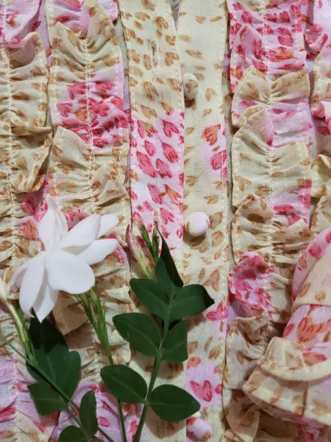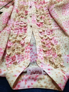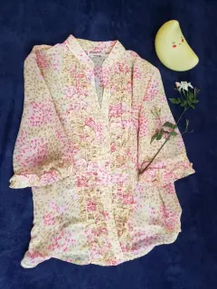 Unico uso, manga 3/4, detalle con olanes al frente y en las mangas, botones forrados, cuello Mao con escote V. Preciosa combinacion de colores. Tela con transparencias ideal para verano, tonos rosados y durazno.