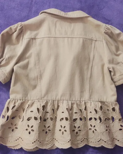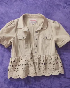 Sobre blusa de tela tipo mezclilla con manga tipo bomber, bordada ligera, viene reducida aunque es talla XL, parece talla L