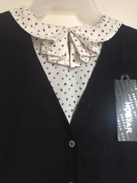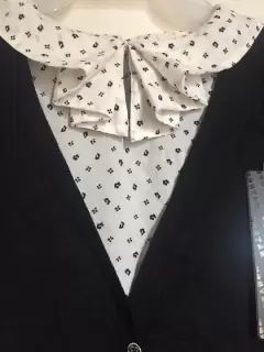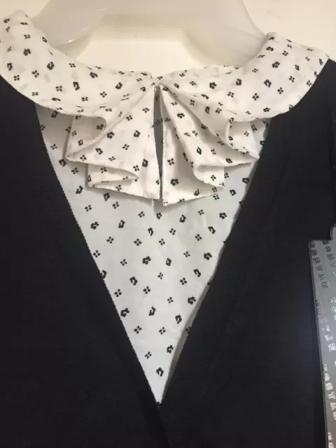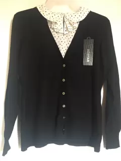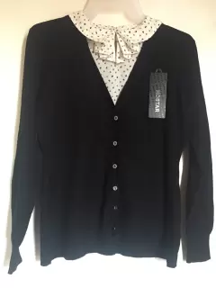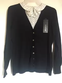 Hermoso suéter negro con blusa simulada en tela blanca con estampados negros; talla S; muy bonita!!!!