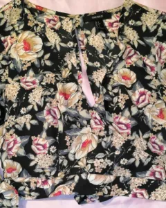 Top. Top con díseño floreado, escote en la espaldaFrente cuello V cruzado y cordon para amarrar en la espaldaManga larga acampada