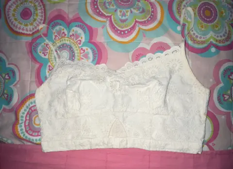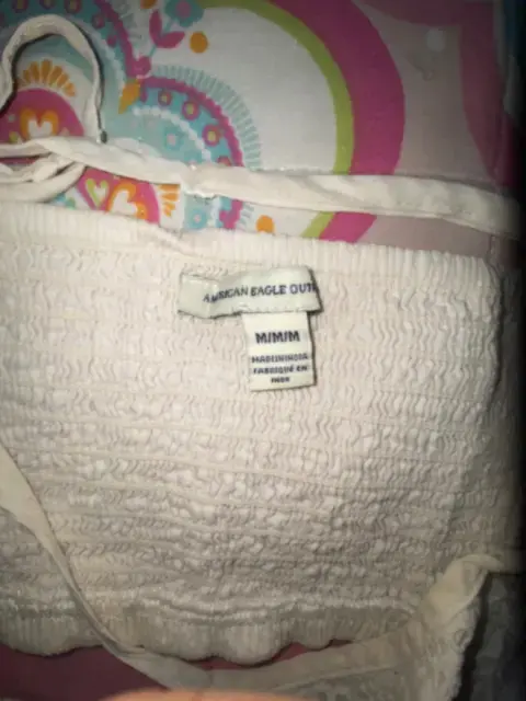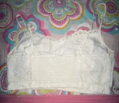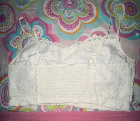 Fresco top de tirantes American Eagle tipo encaje, tiene una mancha pequeñita. Largo: 21 cm. Ancho: 38.5 cm (tiene resorte en la parte de atrás, así que se estira un poco).