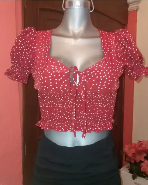 Lindo top, con ribete fruncido, de lunares, cordón delantero.
