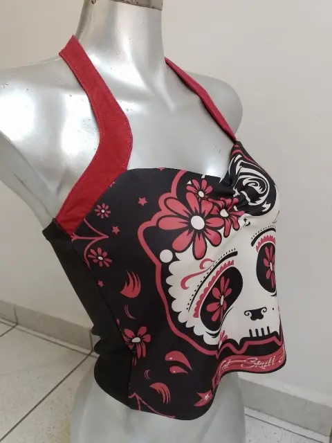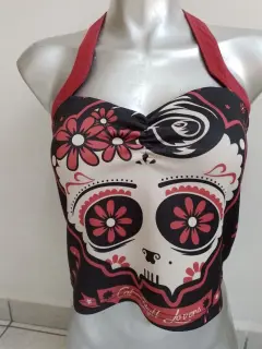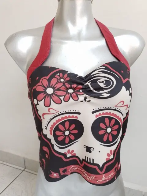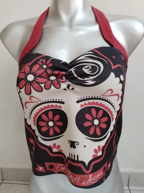 Lindo top Cherry Look, color negro con estampado de calavera, talla chica, una sola puesta, sin detalle, para armar un lindo outfit rockabilly