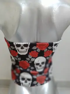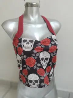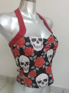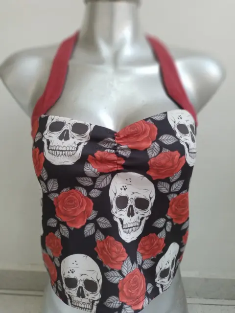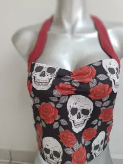 Lindo top Cherry Look, color negro con calaveras, talla chica, una sola puesta, sin detalles, para armar un lindo outfit rockabilly