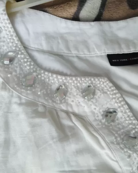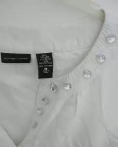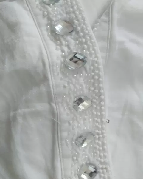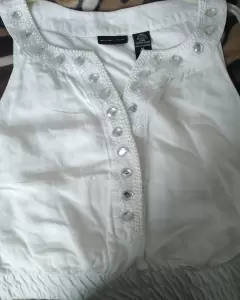 Top blanco con brillos enfrente dice talla xl pero es de m a g tiene forro y la tela no estira es muy bonito