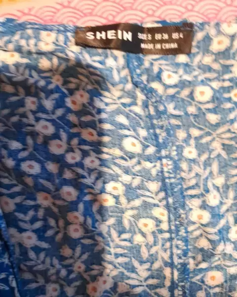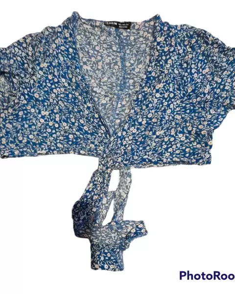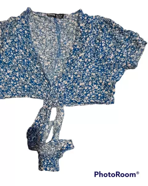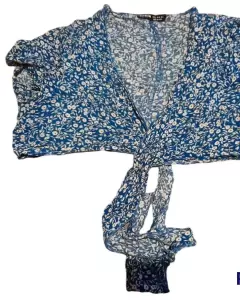 Hermoso top corto de nudo en pecho en color azul con flores blancas. Talla S.