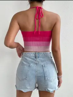 Top crop de cuello halter, tela estira bastante, cruzado en tonalidades rosas.