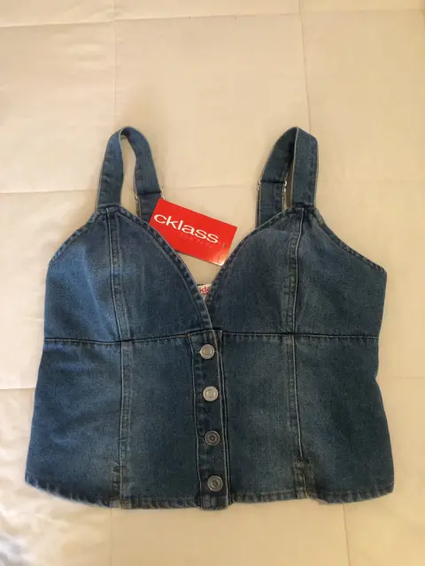 Top de mezclilla, es XL pero viene reducido le queda a talla M .