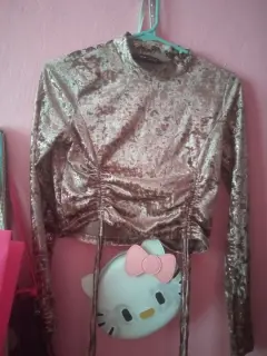 Top de terciopelo Kimberly Loaiza shein. Top de terciopelo con letras doradas brillosas de Kimberly Loaiza nuevo de cuello redondo trae unas cintas abajo para ajustarlo