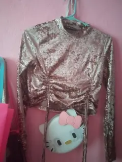 Top de terciopelo con letras doradas brillosas de Kimberly Loaiza nuevo de cuello redondo trae unas cintas abajo para ajustarlo