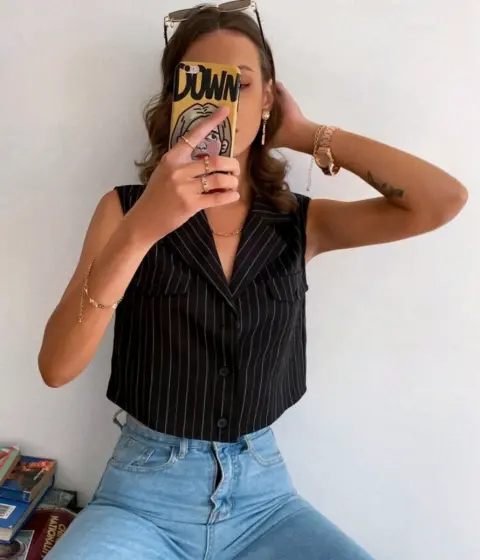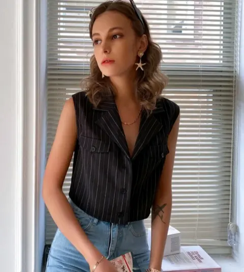 Top formalColor negro con rayas blancasPara oficinaEstilo formalBotones negrosLongitud: CortoSin mangas