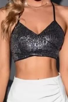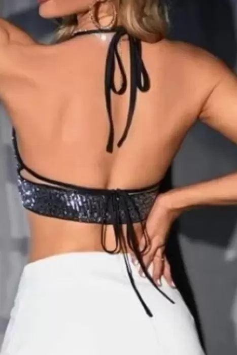 Top halter cruzado de la espalda abierto con cordón envolvente de lentejuelas en color negro que brilla espectacular. Serás una diva con esta pieza única.LARGO 18PECHO 88