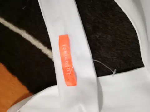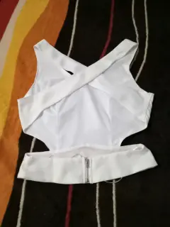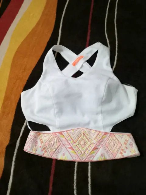 Top lulumari. Top blanco escotado de la espalda con aplicaciones en la cintura tonos naranja & amarillo