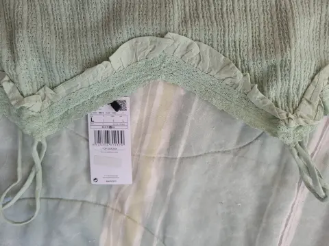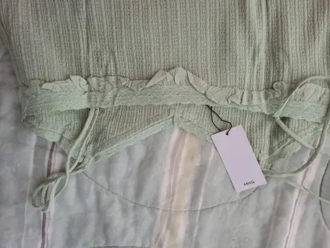 Top Mango nuevo. TOP mango de algodón tipo tejido con olanes y encaje en escote. Color pistacho, línea A muy fresco.