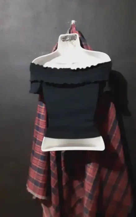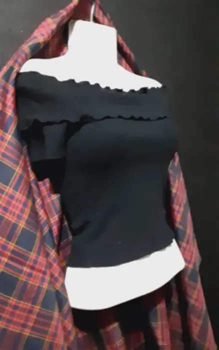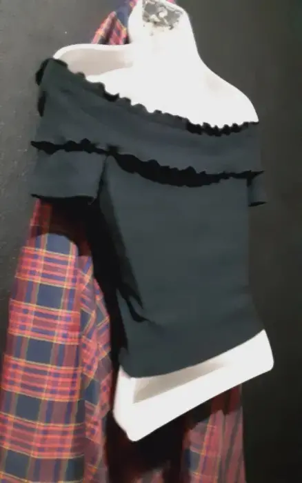 Top negro. Top negro a hombro manga corta se puede subir las mangas, queda al ombligo con olanes de diseño pegado y elástico