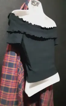 Top negro a hombro manga corta se puede subir las mangas, queda al ombligo con olanes de diseño pegado y elástico