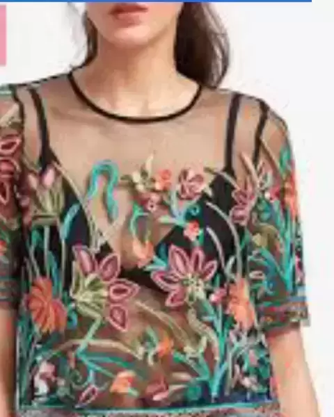 Top negro transparente malla , manga corta con bordado en distintos colores, muy bonita a la cintura, fresca…se puede combinar desde pantalon formal, falda o shorts, te encantará