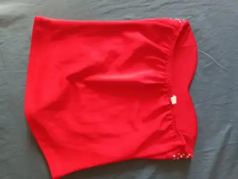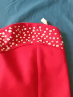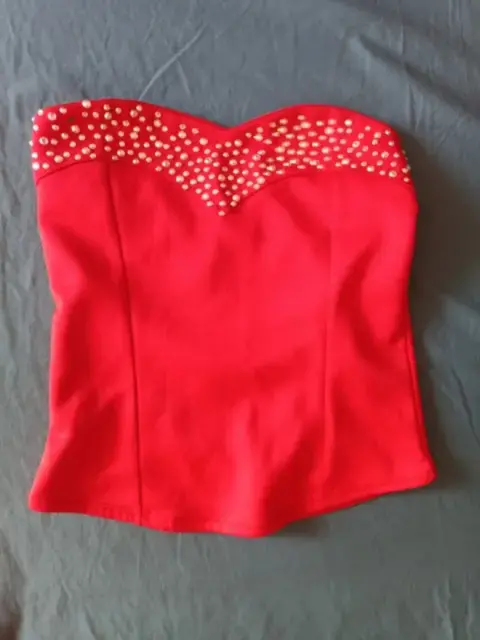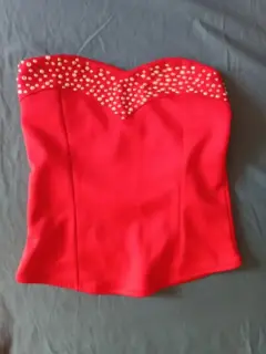 Top rojo con pedreria. Top rojo strapless en forma de corazón, es pegado, tiene pinzas al frente y en la parte de atrás tiene resorte