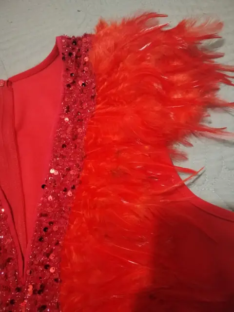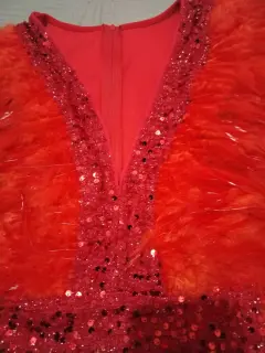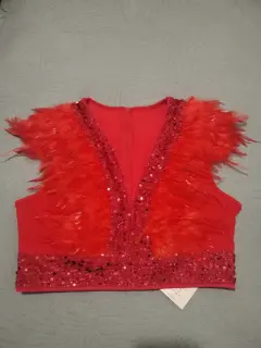 Top rojo de plumas. Top rojo con detalles de pluma y lentejuelas con cierre y tela stretch