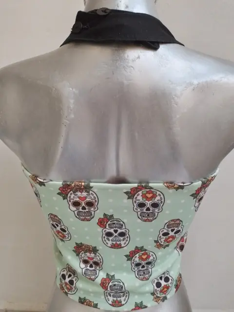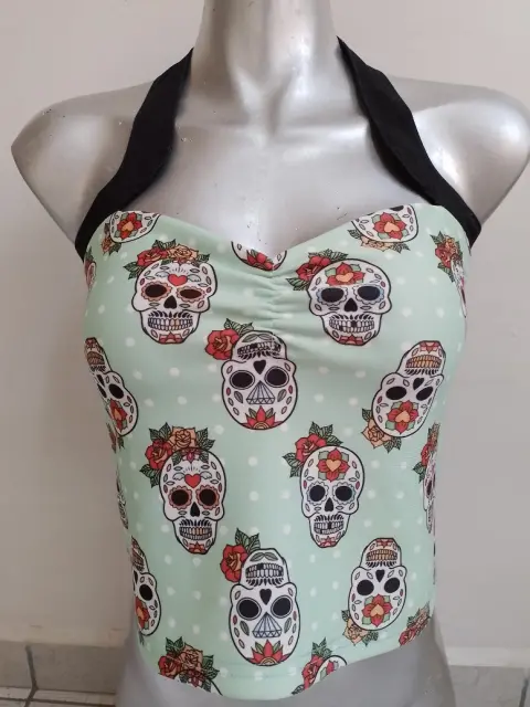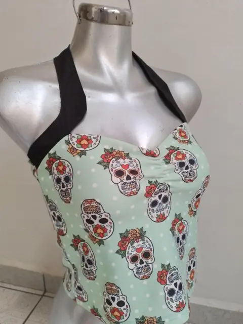 Lindo top Cherry Look, talla chica, color verde agua con estampado de calaveras, una sola puesta, sin detalle, para armar un lindo outfit rockabilly