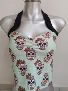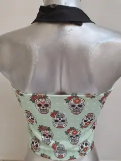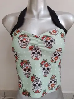 Top Verde Calaveras. Lindo top Cherry Look, talla chica, color verde agua con estampado de calaveras, una sola puesta, sin detalle, para armar un lindo outfit rockabilly