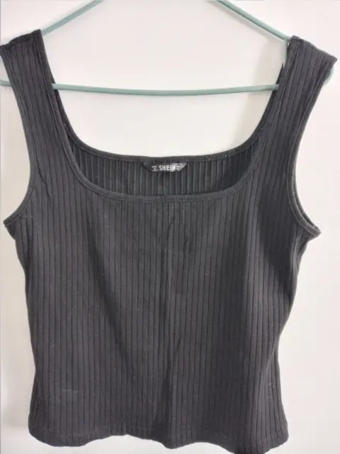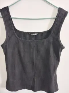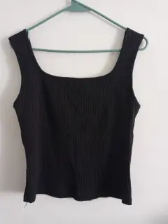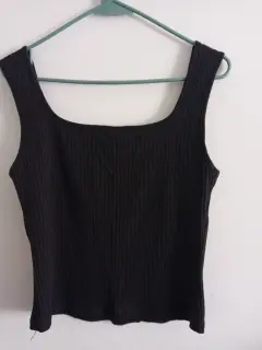 Lindo diseño de top de tirantes en color negro, de canalé, entalla muy bonito al cuerpo y estira. Medidas: largo 51.5 cm Pecho 87 cm, composición 93% algodón 7% Elastano.Se ve igual que la foto. Super bonita y 100% recomendable.