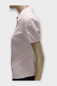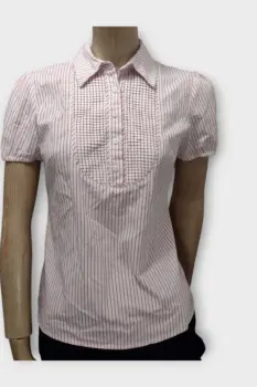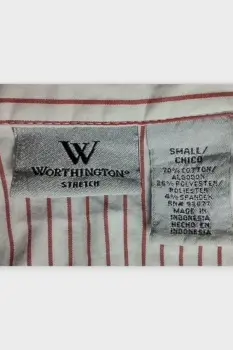 WORTHINGTON Blusa Dama Algodón Blanco SMarca: WORTHINGTONOrigen: IndonesiaMaterial: 70% Algodón 26% Polyester 4% SpandexTalla: SEstilo: BlusaPatrón: BlusaColor: Blanco y rayas rojas Cierre: BotónPecho: 46 cmLargo: 64 cmHombro: 37 cmManga: 21 cmRopa de USO en muy buen estado