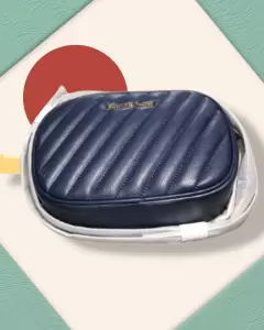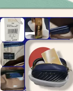 Bolso tipo bandolera Michael Kors para cámara, color azul oscuro, nuevo con etiqueta, valor de venta al público: $378,00, tamaño del producto de piel: aproximadamente 2,6" de ancho inferior x 7,5" de largo inferior x 5 de altura", fabricado con materiales veganos, bolsillos exteriores e interiores, herrajes dorados , correa de hombro ajustable, consulte las imágenes para ver el tamaño y estado cosmético