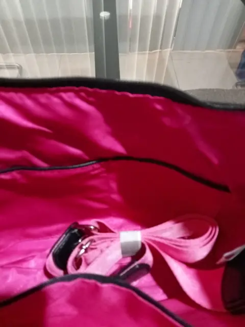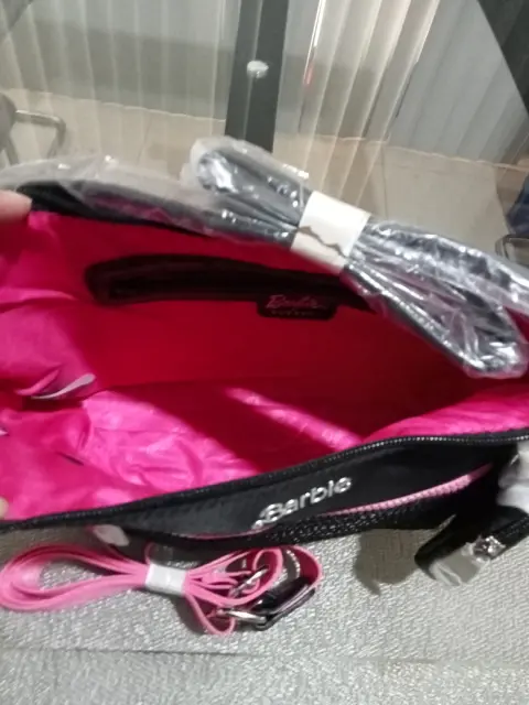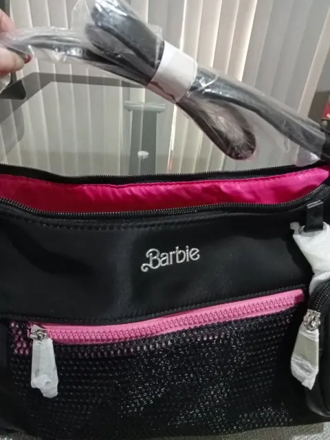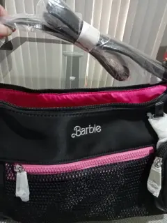 Hermosa bolsa barbi con doble asa ambas largas. Bolsas con cierre y para tarjetas. Bolsita frontal de malla también con cierre.