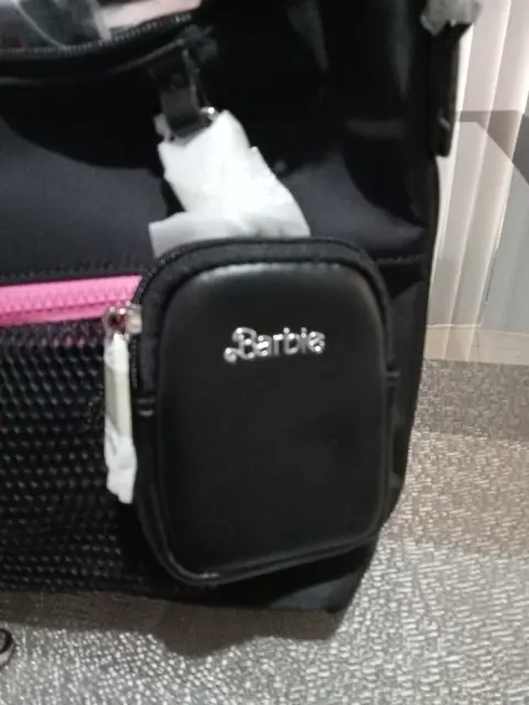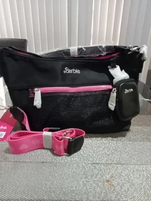 Barbi bolsa. Hermosa bolsa barbi con doble asa ambas largas. Bolsas con cierre y para tarjetas. Bolsita frontal de malla también con cierre.