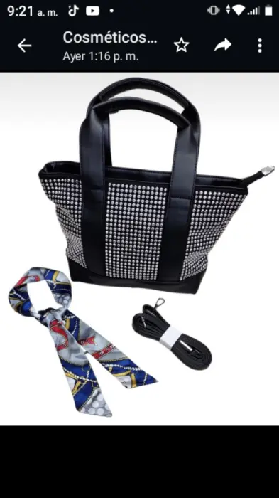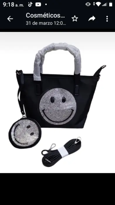 Hermosa bolsa negra con estoperoles, dos modelos diferentes.Una de ellas trae una mascada con su correa y la segunda trae el dibujo de la carita feliz y incluye un monedero, también tiene su correa.
